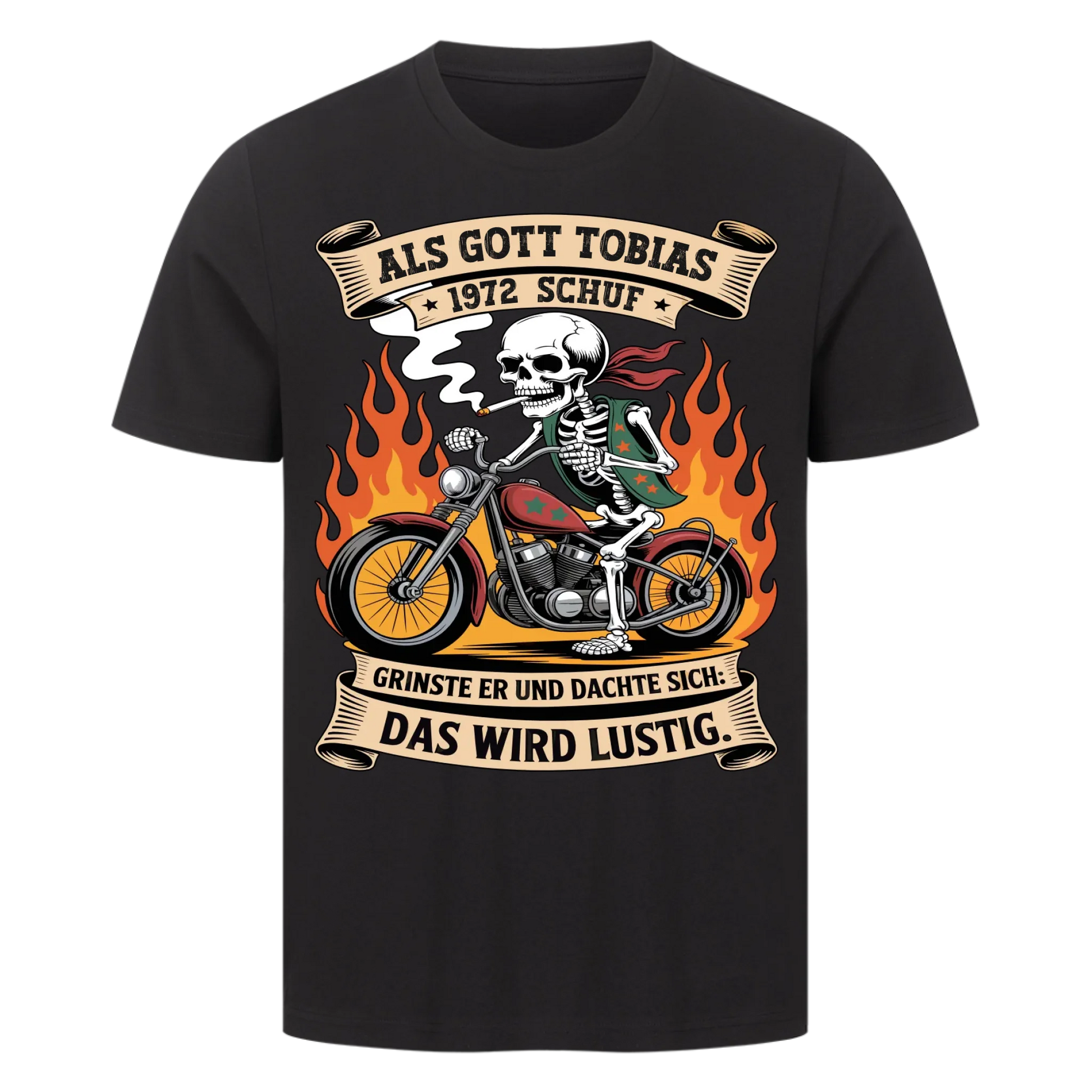 „Als Gott [Name] [Jahr] schuf, grinste er und dachte sich: Das wird lustig.“ Ein Shirt für alle, die wissen: Normal war gestern! Dieses personalisierbare Biker-Shirt zeigt mit Humor und Stil, dass du ein echtes Original bist – wild, frei und einfach unverwechselbar.