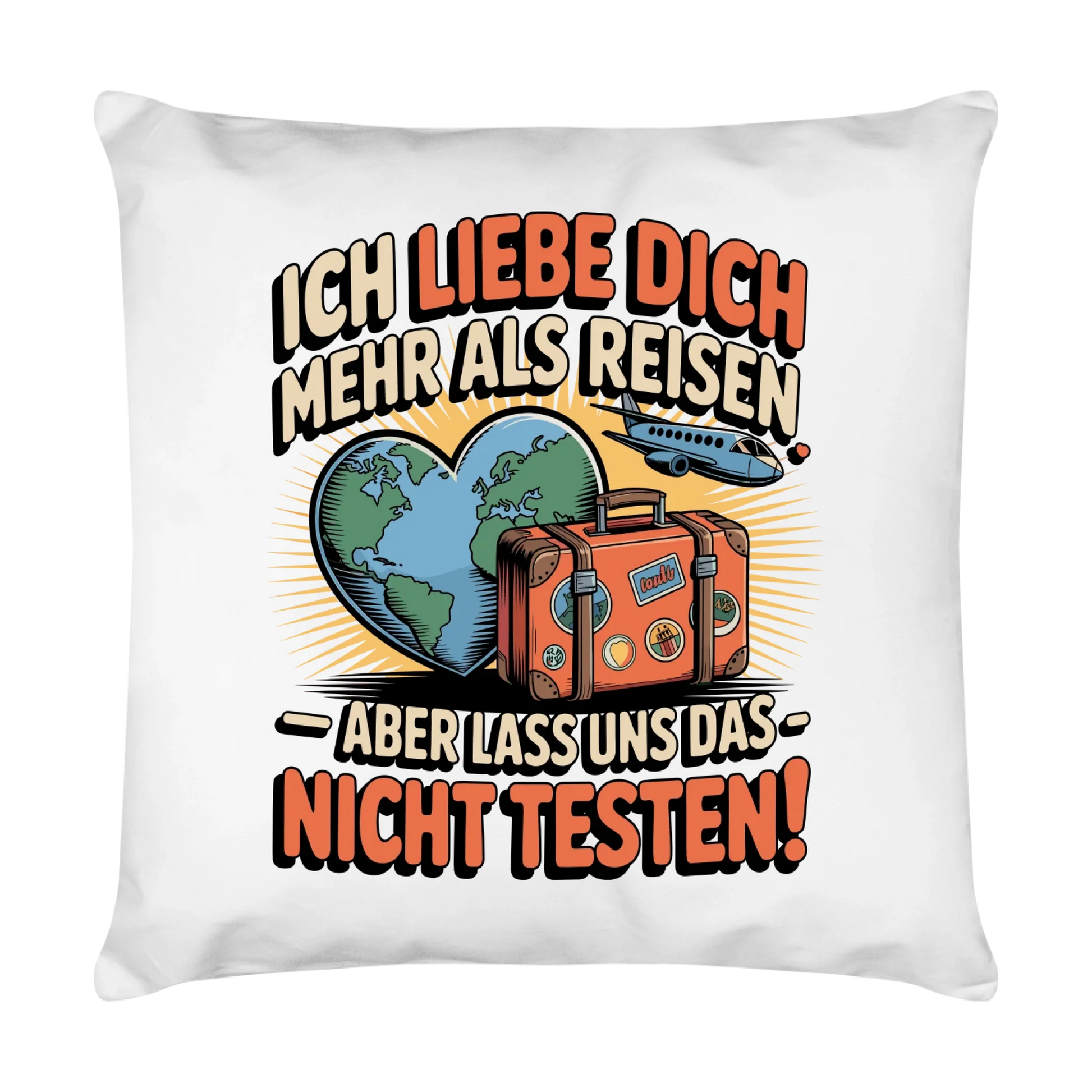 Du liebst das Reisen – aber eine ganz bestimmte Person vielleicht noch ein kleines Stück mehr? Dann ist dieses Kissen wie gemacht für dich (oder zum Verschenken)! Mit dem Spruch „Ich liebe dich mehr als Reisen – aber lass uns das nicht testen!“ wird jedes Sofa, Bett oder Reise-Van zur Bühne für ein charmantes Augenzwinkern.
