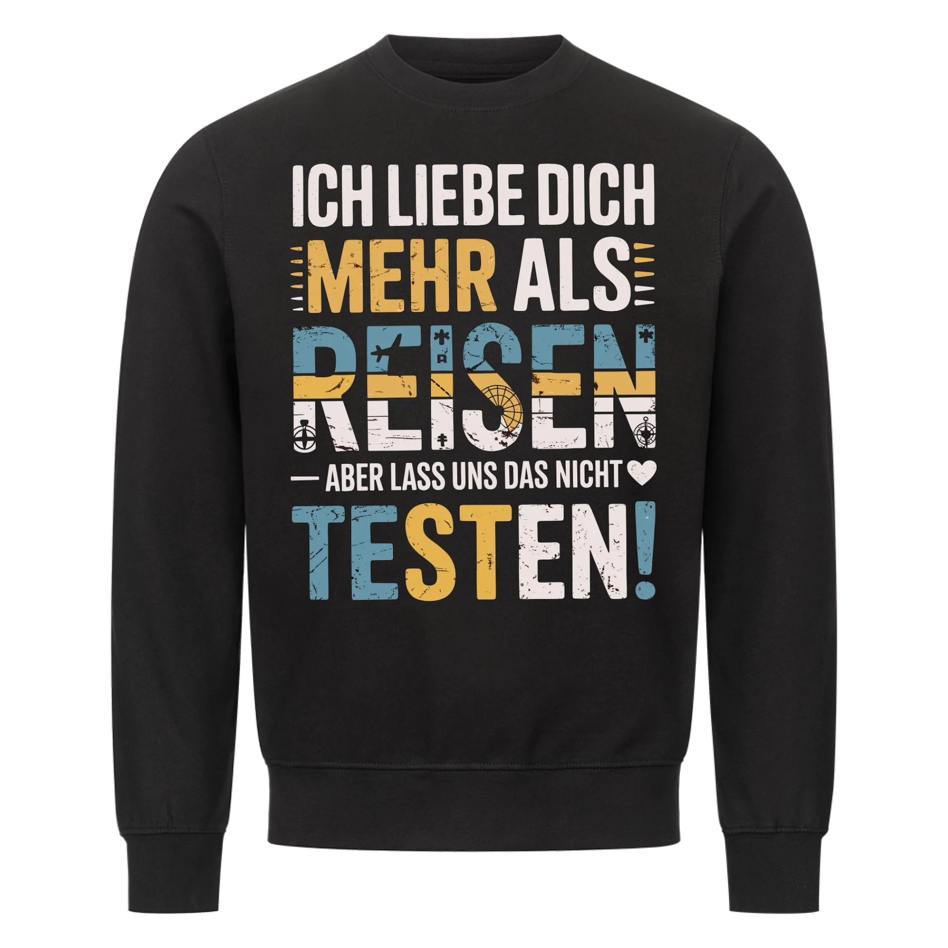 Dieses Sweatshirt ist genau das Richtige für alle, die lieber im Flieger als auf der Couch sitzen – außer der Lieblingsmensch sitzt mit drauf. Der Spruch „Ich liebe dich mehr als Reisen – aber lass uns das nicht testen!“ kombiniert charmanten Humor mit stylischem Design für Alltag, Couch und Flughafen.